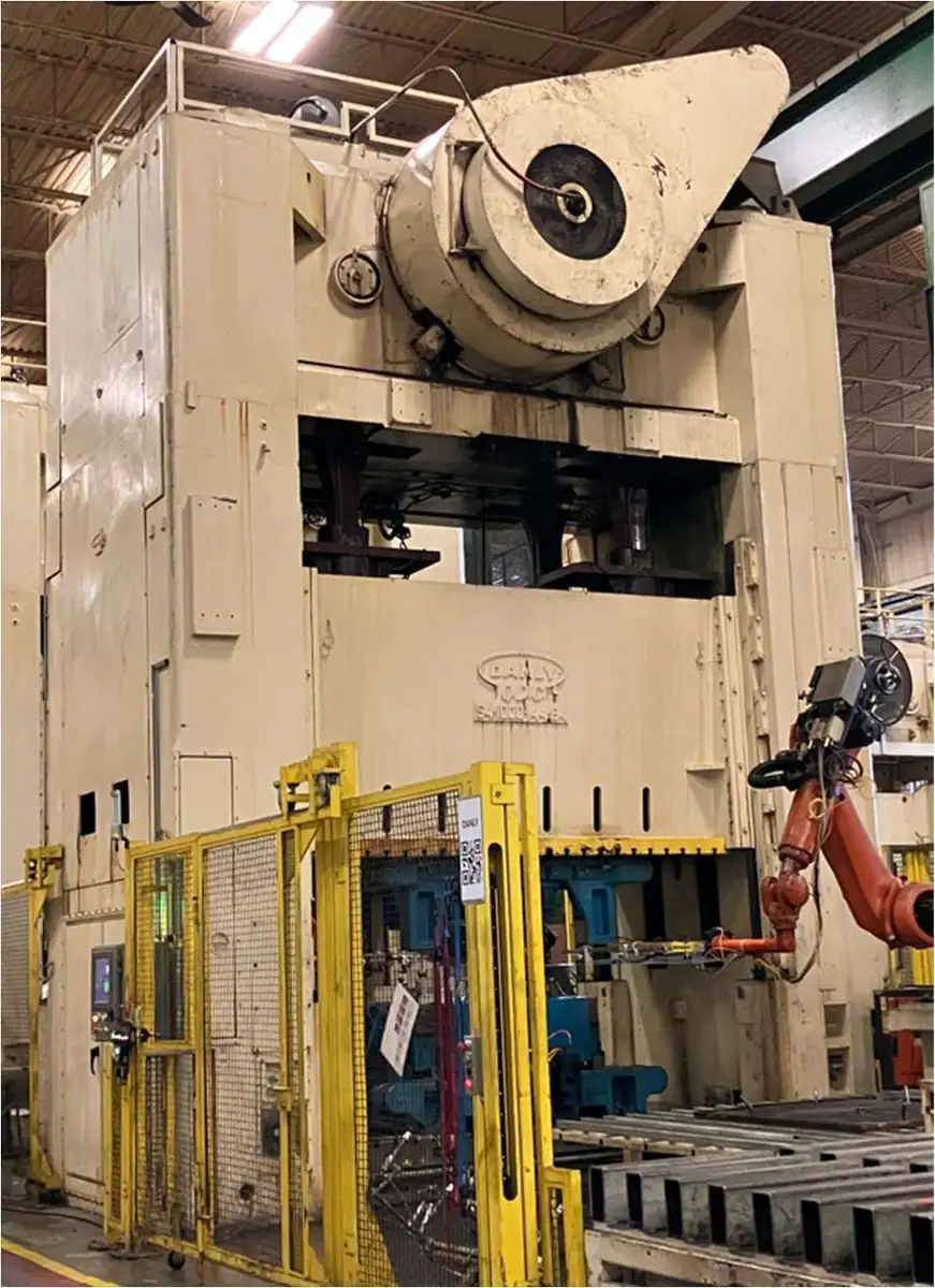 Danly S4-series 1000-ton straight-side press (4-post frame, single main slide). The Danly S4-1000-144-84 is a large straight-side (4-post) mechanical press. The model “S4” denotes a single-slide (single-action) configuration. Only the main ram moves (delivering 1000 tons), and there is no separate blankholder slide. Its drive is a dual-crank (double-eccentric) mechanical system, but functionally it is a single-action press (one moving slide). This makes it a classic 4-post single-action stamping press: a rigid straight-side frame with a single slide (single-action) used for high-tonnage pressing.